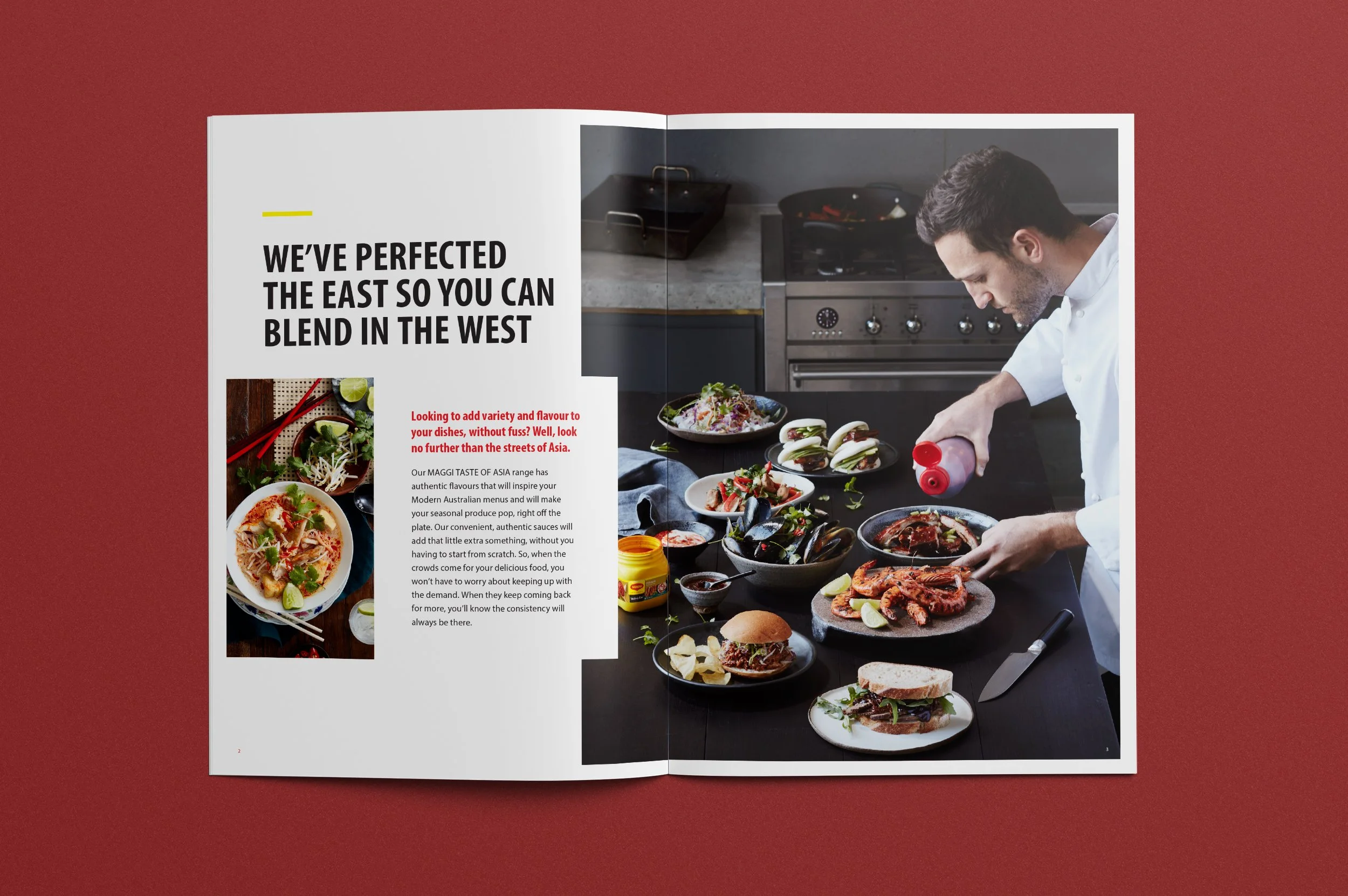 Nestlé’s Maggie Taste of Asia range features a collection of sauces created to assist chefs in crafting various dishes. Instead of beginning from scratch, these sauces enable the creation of authentically flavoured Asian meals. The campaign required food photography showcasing delicious meals using these sauces, which I art directed, along with a recipe book and flyers.